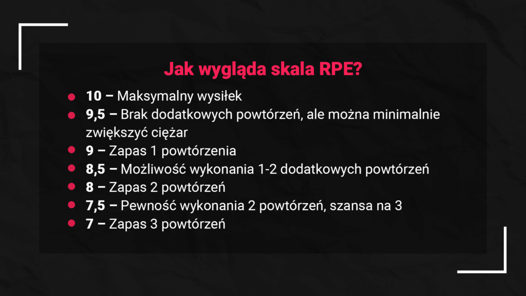 - RPE opiera się na subiektywnej ocenie wysiłku w skali 6.5–10, gdzie 10 oznacza maksymalny wysiłek (brak możliwości wykonania kolejnego powtórzenia). Skala RPE uwzględnia zarówno ciężar, jak i odczucie zmęczenia podczas wykonywania serii.