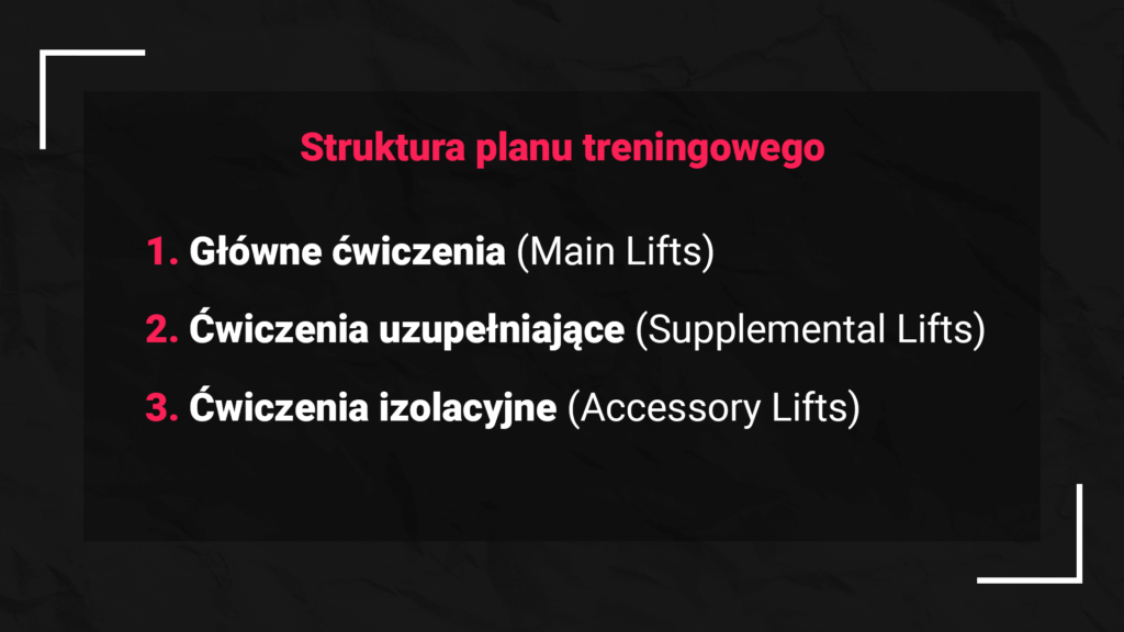 - Główne ćwiczenia (Main Lifts): przysiad, martwy ciąg, wyciskanie.
